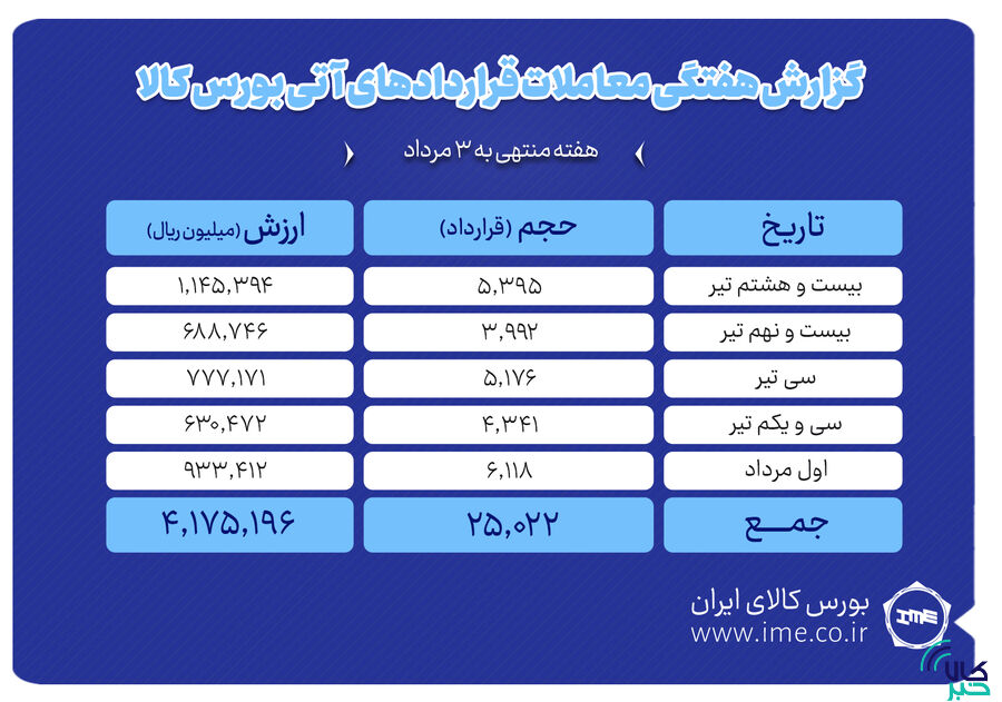 بررسی روند معاملات قراردادهای آتی بورس کالای ایران درهفته منتهی به ۳ مرداد نشان می دهد که در هفته گذشته ارزش معاملات بازار آتی به بیش از ۴۱۷ میلیارد تومان رسید.