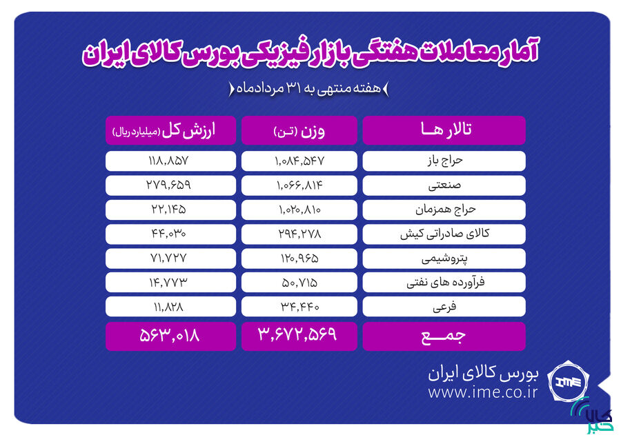 در هفته گذشته تالار محصولات صنعتی و معدنی نیز شاهد معامله ۲ میلیون و ۸۷ هزار و ۶۲۴ تن محصول به ارزش بالغ بر ۳۰ هزار میلیارد تومان بود.در این تالار یک میلیون و ۲۰ هزار و ۸۱۰ تن سیمان، ۵۵۱ هزار و ۲۵۴ تن فولاد،۳۴۳ هزار تن سنگ آهن، ۱۵۹ هزار و ۹۰۰ تن آهن اسفنجی،۶هزار و ۷۵۰ تن آلومینیوم، ۴ هزار و ۹۲۵ تن مس،۸۸۵ تن روی و ۱۰۰ تن چدن معامله شد.