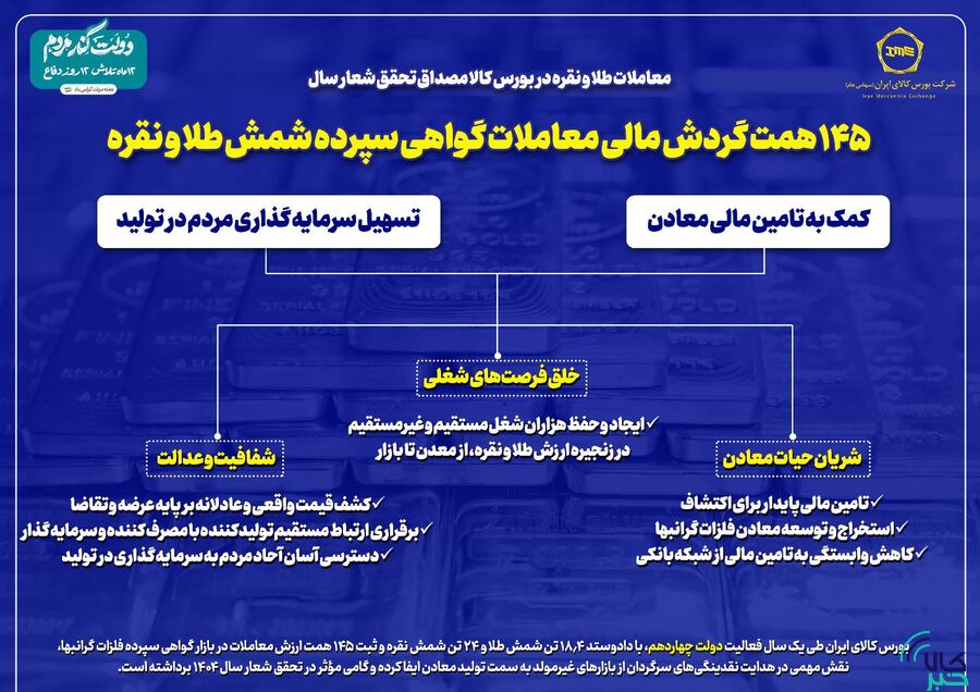 با دادوستد ۱۸.۴ تن شمش طلا به ارزش ۱۴۳ همت و ۲۴ تن شمش نقره به ارزش ۲۳۵۰ میلیارد تومان طی دوره یکساله فعالیت دولت چهاردهم، نه تنها شاهد تامین مالی پایدار برای اکتشاف و توسعه معادن بودهایم، بلکه هزاران شغل مستقیم و غیرمستقیم در این زنجیره ارزش خلق و حفظ شده است.