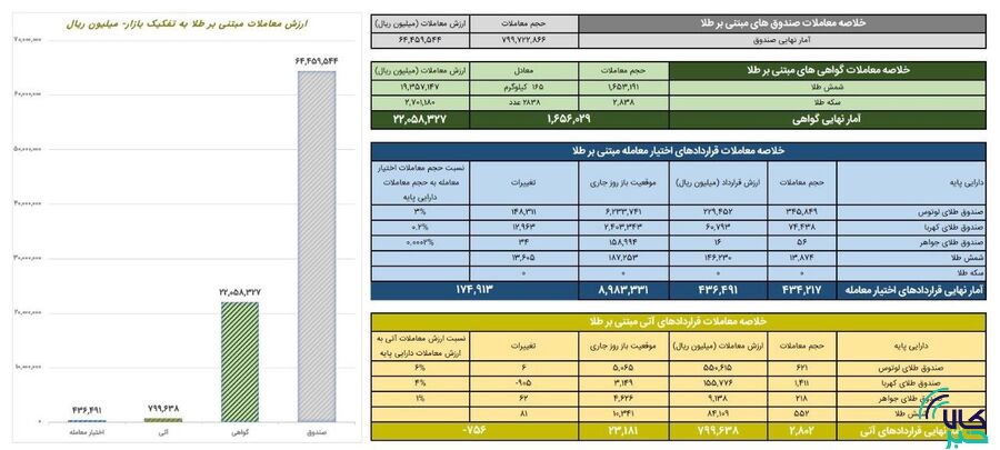 در معاملات روز گذشته بازار ابزارهای مبتنی بر طلای بورس کالای ایران در مجموع ۷۹۹ میلیون و ۷۲۲ هزار واحد صندوق های مبتنی بر طلا به ارزش بیش از ۶.۴ معامله شد. روز گذشته معاملات صندوق طلای لوتوس با ۶ درصد بیشترین نسبت ارزش معاملات آتی به ارزش معاملات دارایی پایه را داشت.