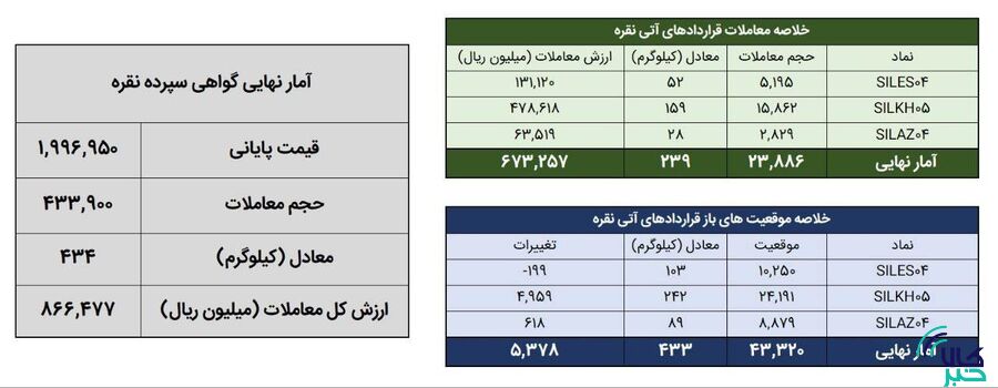 همچنین ۲۳ هزار و ۸۸۶ قرارداد آتی معادل ۲۳۹ کیلوگرم شمش نقره به ارزش ۶۷.۳ میلیارد تومان منعقد شد. در پایان روز معاملاتی گذشته موقعیت های باز قراردادهای آتی نقره معادل ۴۳۳ کیلوگرم شمش نقره بود. در قراردادهای آتی افزایش ۵ هزار و ۳۷۸ موقعیت در مجموع موقعیت های باز قراردادهای مبتنی بر نقره بودیم.
