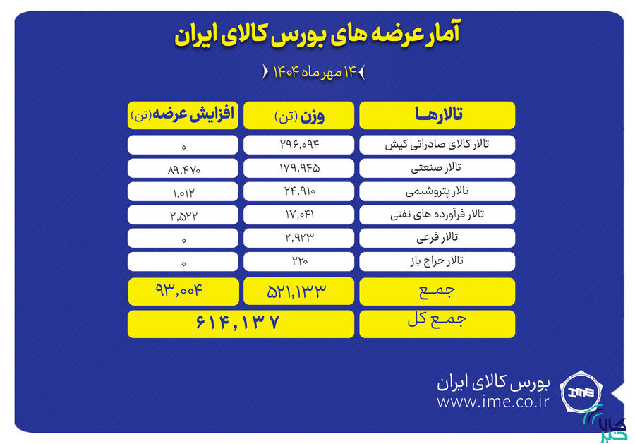 تالارهای بورس کالای ایران امروز دوشنبه ۱۴ مهر ماه میزبان عرضه ۶۱۴ هزار و ۱۳۷ تن انواع محصول است. بیشترین عرضه امروز متعلق به تالار صادراتی و بعد از آن تالار صنعتی است.