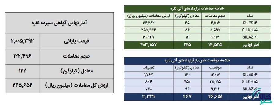 همچنین ۱۴ هزار و ۵۲۵ قرارداد آتی معادل ۱۴۵ کیلوگرم شمش نقره به ارزش ۴۰.۳ میلیارد تومان منعقد شد. در پایان روز معاملاتی گذشته موقعیت های باز قراردادهای آتی نقره معادل ۴۶۷ کیلوگرم شمش نقره بود. در قراردادهای آتی افزایش ۳ هزار و ۳۳۱ موقعیت در مجموع موقعیت های باز قراردادهای مبتنی بر نقره بودیم.