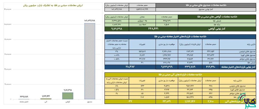 در قراردادهای اختیار معامله مبتنی بر طلا نیز ۴۱۹ هزار و ۳۲۰ قرارداد به ارزش ۳۴ میلیارد تومان دادوستد شد. در قراردادهای اختیار معامله صندوق طلای لوتوس با ۲ درصد بیشترین نسبت حجم معاملات قراردادهای اختیار معامله به حجم معاملات دارایی پایه را داشت.