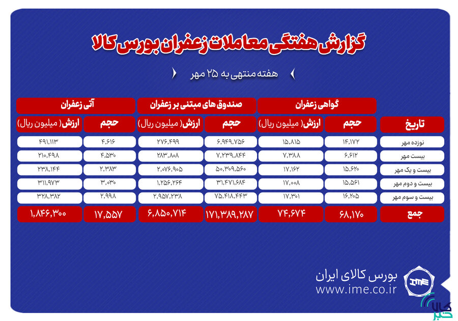 گزارش هفتگی معاملات زعفران نشان می‌دهد که در هفته منتهی به ۲۵ مهر ماه بیش از ۱.۷ تن زعفران نگین به ارزش ۱۸۴.۶ میلیارد تومان در بازار آتی بورس کالا داد و ستد شد.