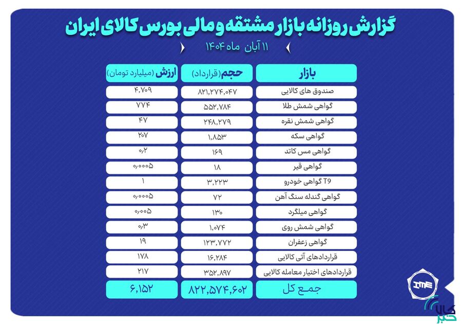 روز گذشته همچنین ۳۵۲ هزار و ۸۹۷ قرارداد اختیار معامله کالایی به ارزش ۲۱۷ میلیارد تومان منعقد شد. روز گذشته در چهار نماد شمش طلا، جواهر، صندوق طلای لوتوس و کهربا معامله انجام شد که بیشترین ارزش معاملات به قراردادهای اختیار معامله شمش طلا اختصاص یافت.در این روز حجم معاملات تمام قراردادهای اختیار معامله نماد شمش طلا ۱۶۶،۸۰۲ قرارداد بود.