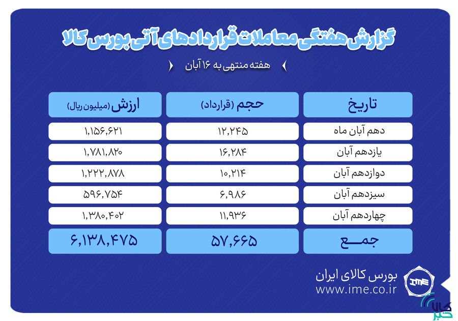 به گزارش کالاخبر ، در هفته گذشته ۵۷ هزار و ۶۶۵ قرارداد آتی به ارزش ۶۱۳ میلیارد تومان منعقد شد. بیشترین حجم و ارزش معاملات نیز به روز ۱۱ آبان اختصاص یافت به طوری که در این روز ۱۶هزار و ۲۸۴ قرارداد به ارزش بیش از ۱۷۸ میلیارد تومان منعقد شد.