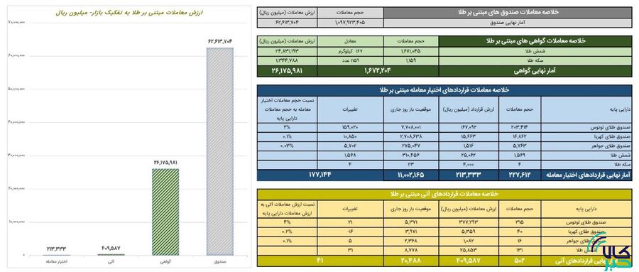 در قراردادهای اختیار معامله مبتنی بر طلا نیز ۲۲۷ هزار و ۶۱۲ قرارداد به ارزش ۲۱ میلیارد تومان دادوستد شد. در قراردادهای اختیار معامله نیز صندوق طلای لوتوس با ۲ درصد بیشترین نسبت حجم معاملات قراردادهای اختیار معامله به حجم معاملات دارایی پایه را داشت.