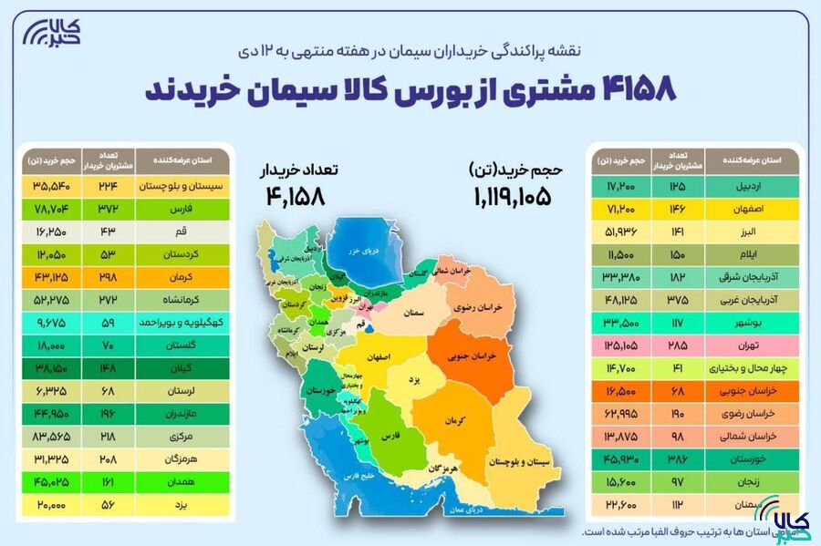 طبق آمار، استان هایی که بیشترین حجم خرید سیمان را در بورس کالا داشته اند، به ترتیب عبارتند از تهران ۱۲۵ هزار و ۱۰۵ تن، استان مرکزی ۸۳ هزار و ۵۶۵ تن، استان فارس ۷۸ هزار و ۷۰۴ تن و اصفهان ۷۱ هزار و ۲۰۰ تن در صدر جدول حجم خرید سیمان از بورس کالا قرار دارند.