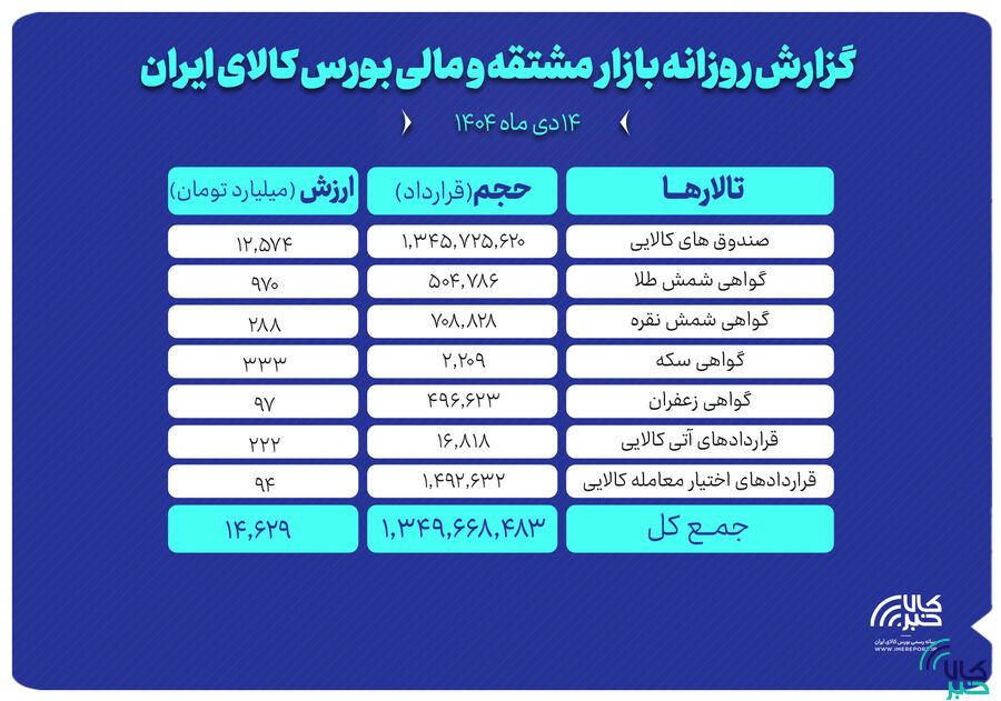 روز گذشته همچنین یک میلیون و ۴۹۲هزار و ۶۳۲ قرارداد اختیار معامله کالایی به ارزش ۹۴ میلیارد تومان منعقد شد.روز گذشته در پنج نماد شمش طلا، صندوق طلای لوتوس، درخشان، جواهر و کهربا معامله انجام شد که بیشترین ارزش معاملات به قراردادهای اختیار معامله لوتوس اختصاص یافت.در این روز حجم معاملات تمام قراردادهای اختیار معامله نماد صندوق طلای لوتوس ۷۷۶،۳۷۵ قرارداد بود.