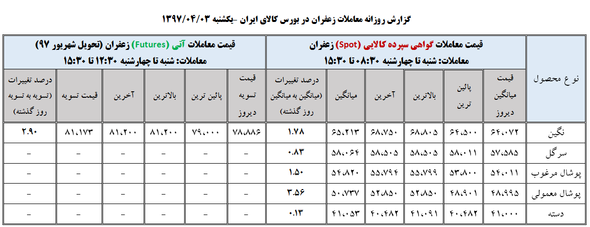 • جدول روزانه معاملات زعفران در بورس کالا (۴ تیر ۹۷)