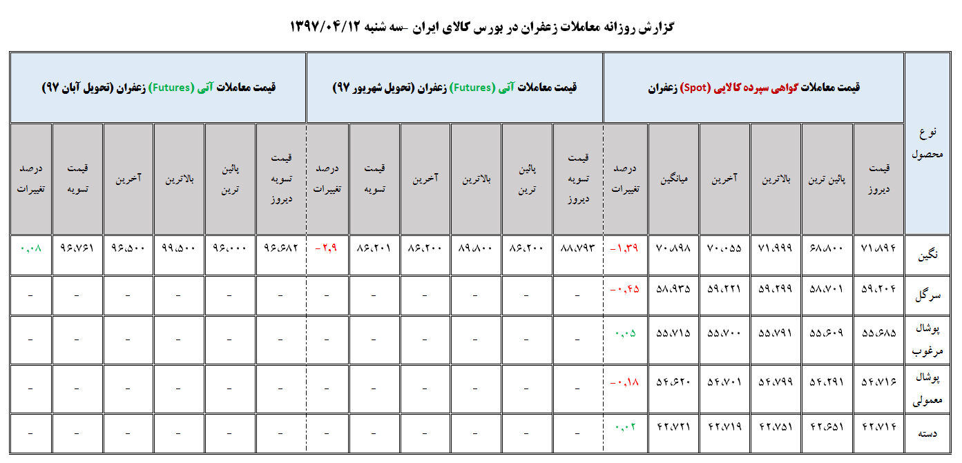 • جدول روزانه معاملات زعفران در بورس کالا (۳ تیر ۹۷)