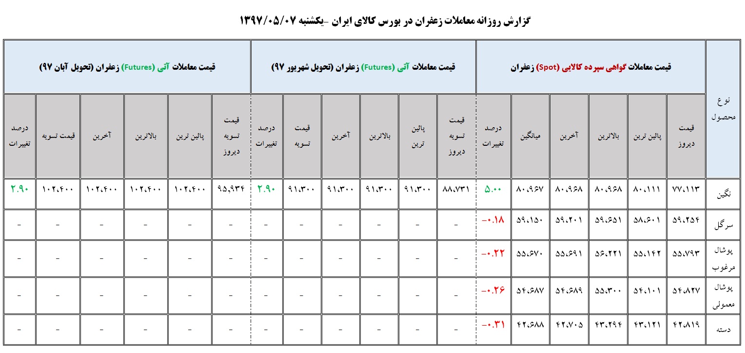 جدول روزانه معاملات زعفران در بورس کالا(۷ مرداد ماه ۹۷)