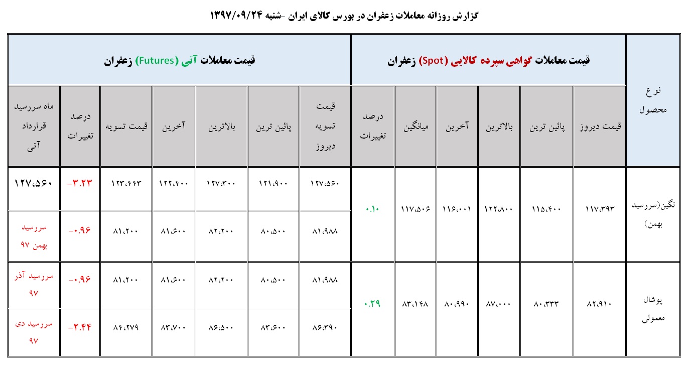 • جدول روزانه معاملات زعفران در بورس کالا ( ۹ دی ماه ۹۷)